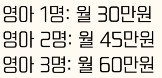지원금액이 가장 궁금하실 것 같습니다. 영아의 명 수따라 차등 지급이 되며, 시간도 모두 차등입니다.