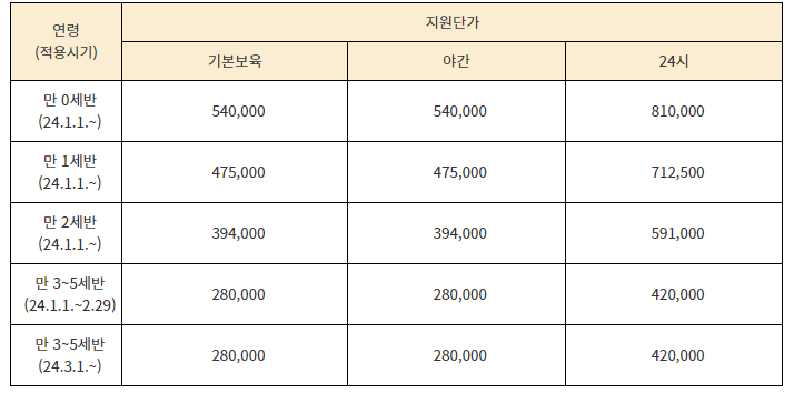 아동 1명당 지원되는 보육료로 나이별로 금액은 상이하며, 위의 표를 참고하시면 됩니다.